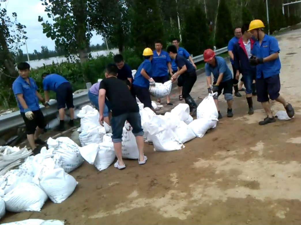 上口镇前王、后赵受灾严重,洪水无情的冲泡了整个村庄,公司领导国焕然和刘云龙路经此地,见到如此险情立即电话安排,让公司在最短的时间派车送来了钢板、钢管堵住了洪水,让两村人民群众的生命和财产安全得到了最大程度的保障。