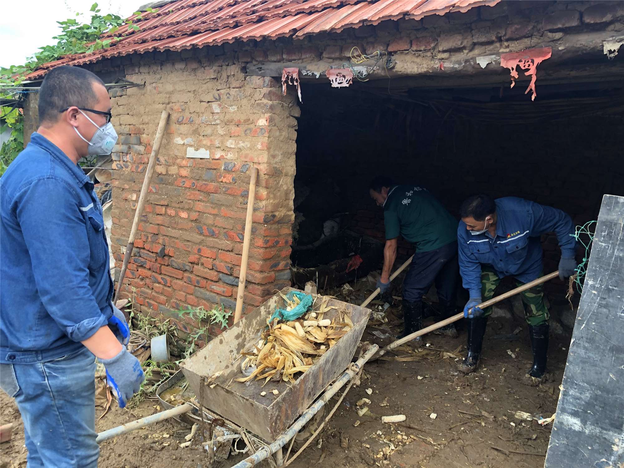在到达营里镇南王家庄子村后,我们发现洪水过后,村内大街小巷淤泥沉积,群众出行特别困难,村内环境卫生堪忧,日常生产生活无法正常开展,受灾情况严重。